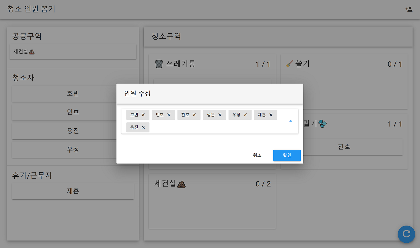 청소시간에 청소구역을 추첨하는 시간을 줄이고자 청소구역뽑기 앱을 만들고있다.